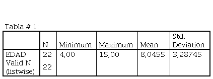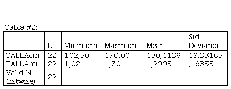 En la tabla #1 se puede observar la descripción estadística de la variable general que es: la edad; el número de deportistas valorados (22), el promedio o media en la que se encuentran cada uno de estos deportistas y el rango de desviación que presentan con respecto a las variables medidas.