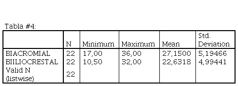 En la tabla #4 se puede observar la descripción estadística de los deportistas valorados (22), con respecto al diámetro, el promedio o media en la que se encuentran cada uno de estos deportistas y el rango de desviación que estos presentan en su medida. Dentro de los pliegues valorados encontramos: Biacromial, Biliocrestal.