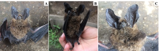 Las fotografías fueron revisadas en detalle, reconociendo algunas características morfológicas del individuo y el promedio de las medidas. Se logró identificar que es un representante del género Histiotus, individuo que correspondió a un macho aparentemente adulto, con una longitud total estimada de 62 mm, una longitud del pelaje entre las escápulas de aproximadamente 14 mm, pelo bicolor, con las puntas más claras que la base, el vientre blanquecino y el dorso pardo castaño (Fig. 2A); alas anchas, cortas y pálidas (Fig. 2A y 2B); orejas de color claro con medida menor a 30 mm (Fig. 2C); orejas que se destacan a simple vista por ser grandes y de mayor tamaño en comparación con la cabeza (Gervais, 1856; Bárquez et al., 1999; Rodríguez-Posada et al., 2021).