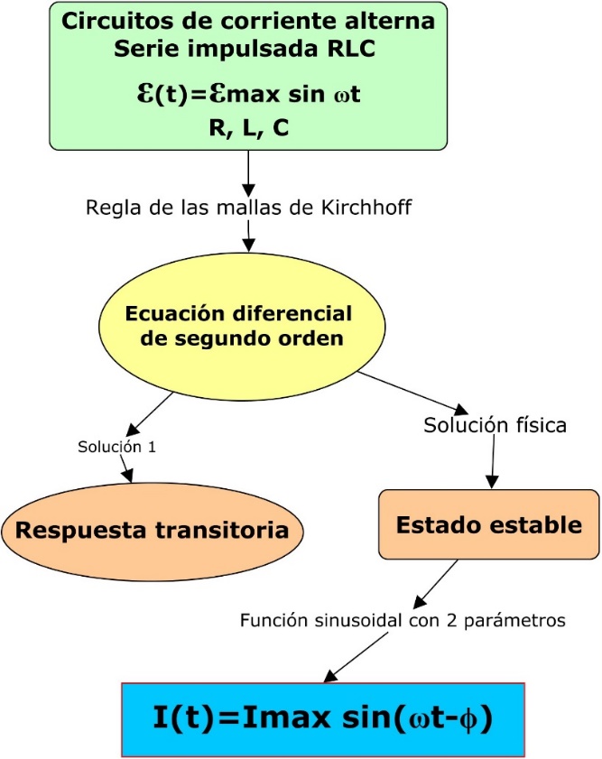 Se intuye que aparecen conceptos nuevos que hay que anclar a los ya existentes. Anclar y contextualizar; es decir, establecer relaciones con los otros conceptos previamente aprendidos. A continuación se presenta un mapa conceptual que aportará una nueva herramienta para analizar de manera lógica la estructura subyacente en los circuitos de corriente alterna (ESCOBAR et al, 2016). Lo que se acaba de comentar sobre la ecuación diferencial y sus dos soluciones está jerárquicamente esquematizado en el mapa conceptual que aparece en la Figura 1.