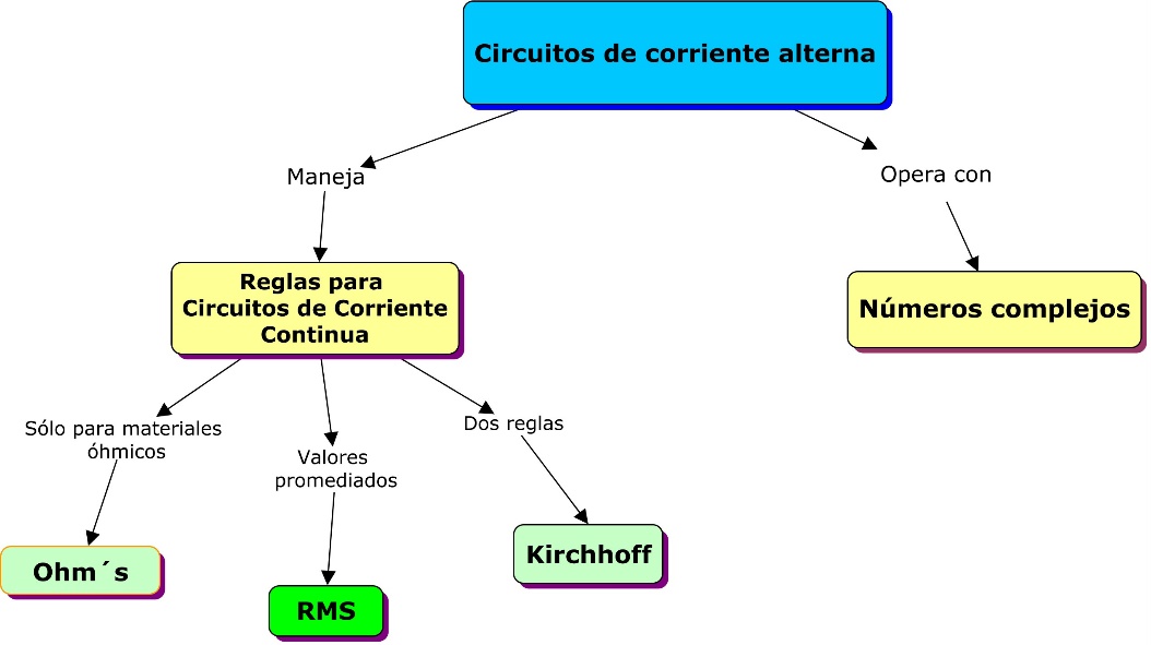 Los mapas conceptuales nos permiten elaborar y comunicar ideas y conceptos complejos de una manera muy flexible y estructurada; también promueven el trabajo colaborativo entre los estudiantes para formalizar vínculos operativos y/o conceptuales entre las diferentes magnitudes involucradas en los circuitos de corriente alterna. Mediante el uso de fasores (en el instante inicial) se establece una correspondencia biunívoca entre el cuerpo algebráico de los números complejos y el plano bidimensional.