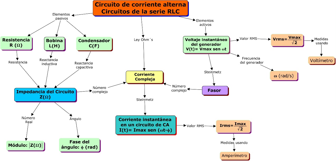 A finales del siglo XIX y comienzos del siglo XX, en 1925, Charles Proteus Steinmetz desarrolló la teoría de los fasores (toda magnitud sinusoidal se puede representar mediante un fasor; es decir, un vector giratorio en sentido antihorario. Normalmente, y para simplificarlo, se representan en en instante inicial) y de los número complejos, aplicando ambos conceptos a los circuitos de corriente alterna. Todos los conceptos que se conocen para los circuitos de corriente continua se pueden aplicar a los de corriente alterna siempre y cuando se trabaje con números complejos y calcule posteriormente sus módulos, habiendo tenido la precaución de trabajar con valores eficaces. Esto se puede visualizar y jerarquizar en el mapa conceptual que aparece en la Figura 2.
