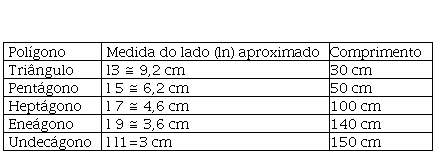 O Quadro 2 se refere às medidas dos lados dos polígonos de n lados, com n natural, ímpar e menor ou igual a onze, inscritos na circunferência de raio r ≅ 5,3 cm, a partir do que são construídos os outros polígonos por dobradura.