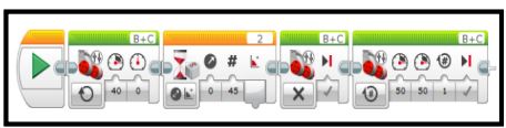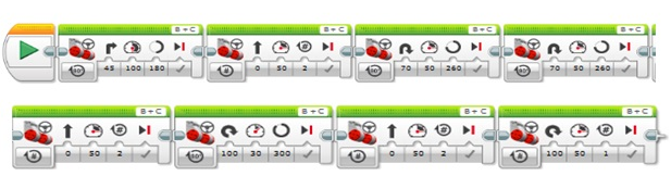 O desenvolvido das atividades seguiu o encaminhamento proposto no plano de atividades da ação, elaborados pelos pesquisadores: a) reconhecimento, pelos participantes da ação, da ferramenta mediadora do conhecimento, através da montagem, desmontagem e remontagem dos carrinhos robôs; b) introdução básica à programação simples dos carrinhos LEGO, o que capacitou aos participantes tentarem realizar a programação distinta de cada forma geométrica; c) do total de frequentes ao minicurso, ocorreu a partição em cinco grupos, sendo que cada um ficou responsável pela programação e implemento de uma forma geométrica específica (quadrado, retângulo, triângulo, círculo e losango). Um exemplo de programação desenvolvida, pelos grupos, é apresentado na Figura 2.