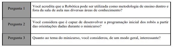 Ao final do minicurso, foi aplicado, com os participantes, um questionário referente ao mesmo, com o intuito de recuperar informações e impressões sobre a realização, aplicação e compartilhamento de conhecimentos acerca da robótica educacional, como metodologia de ensino, ferramenta mediadora do conhecimento, fonte de pesquisa, conhecimento agregado e estudos sobre educação e tecnologia.