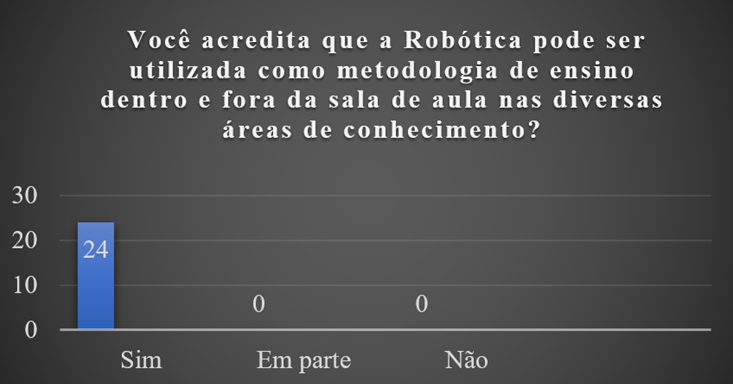 A partir das perguntas apresentadas no Quadro 1, obteve-se então, os seguintes resultados. De acordo com o Gráfico 1, todos os 24 participantes, acreditam que a Robótica Educacional pode atuar como ferramenta mediadora de conhecimento, reafirmando o que foi descrito por Araújo e Mafra, (2015), sobre o uso da Robótica Educacional como instrumento mediador de ensino, e reiterado por depoimentos dos participantes, tais como: A – “Muito proveitoso para nossa capacitação profissional.”; B – “Precisamos praticar mais”; C – “Muito interessante, pois estava precisando aprender sobre esse lado da educação, e categoria de aprendizagem que se pode passar na sala de aula”.