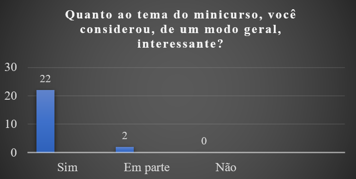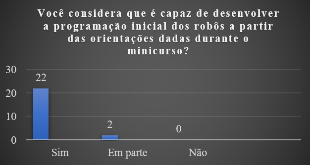 No estudo desenvolvido por Barbosa (2016), observou-se que “durante as oficinas de robótica na escola, vimos a necessidade de aprofundar a programação [...], percebemos que alguns alunos ainda estavam tendo dificuldade de entender a lógica de programação” (p. 235). Tal consideração, aproxima-se com as informações indicadas no Gráfico 2, no qual se destaca que, 22 participantes afirmaram conseguir desenvolver uma programação inicial, enquanto 2 acreditam que conseguiriam “em parte”, considerando o que foi ministrado durante o minicurso.