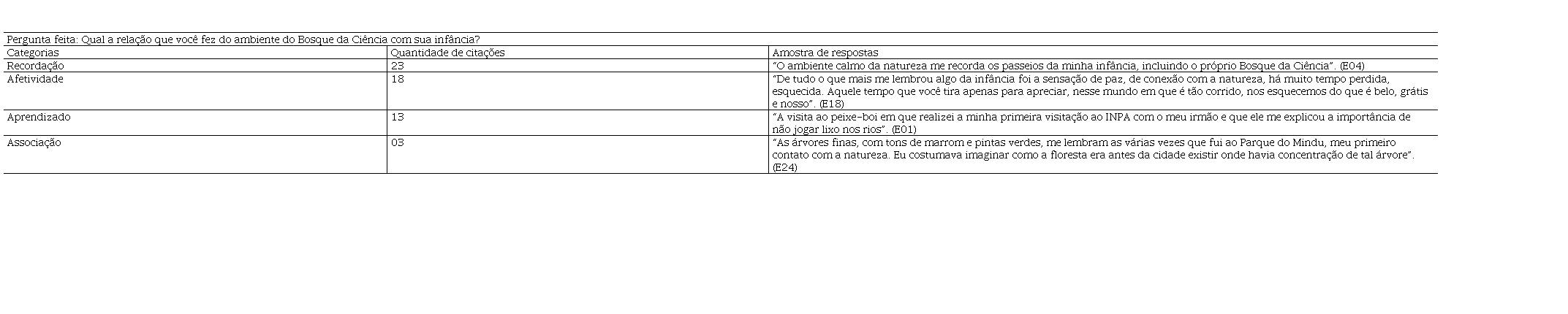 A pessoa inicia o relato com uma interjeição, demostrando, claramente, a situação de deslumbramento ante a relação feita entre o ambiente do Bosque da Ciência com a vida que teve em uma localidade do interior do Amazonas quando criança, na qual tece a experiência de andar descalça e sentir o pé no chão, dando ênfase ao fato do caminhar ser em terra e não em estrutura pavimentada. Cornell (2008, p. 176), releva em seu estudo ser necessário entrar no ambiente natural “com o coração aberto, permitindo que esplêndidas experiências nos surpreendam”.