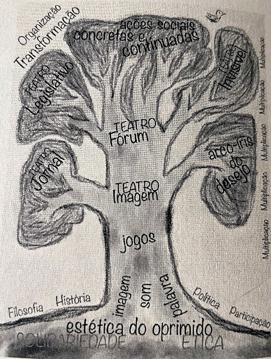Subindo pelo tronco da árvore, vemos a palavra, o som e a imagem. Canais pelos quais a Estética do Oprimido “alimenta” toda esta árvore. Porque, como nos diria Boal (2009), existe uma forma de pensar não verbal e é esta forma que possibilitou o surgimento das técnicas desenvolvidas pelo T.O., por meio de jogos, destacadas nos galhos e tronco da árvore: Teatro-Imagem, Teatro-Jornal, Teatro-Legislativo, Teatro-Fórum, Teatro-Invisível e o Arco-Íris do Desejo.