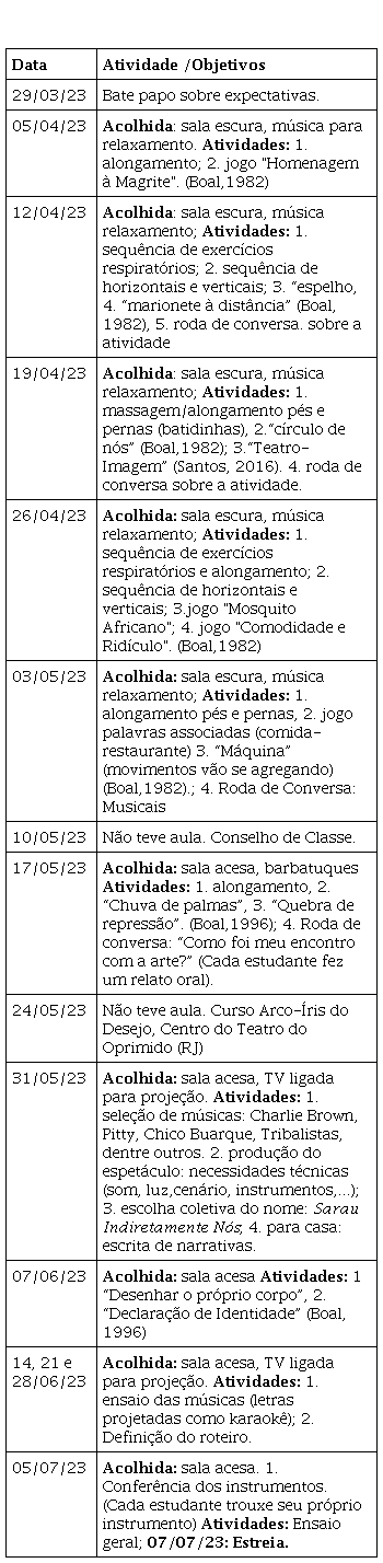Diante de expectativas tão díspares, optamos pela realização de um percurso que discutisse as potencialidades das carreiras no setor cultural, mas principalmente que estivessse voltado para uma formação estética cidadã, enquanto parte de uma formação integral destes estudantes. Uma (auto)formação ancorada em uma reflexividade narrativa (Passeggi, 2021) que permitisse a cada participante refletir sobre si - sua trajetória e projeções de futuro -, sobre os outros e suas interações na sociedade, por meio do Teatro, da poesia e da música.