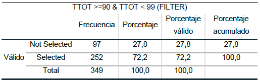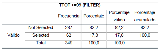Se muestran a los docentes que cuentan con un promedio mayor de 99 en la calificación que obtuvieron en la evaluación realizada por los estudiantes de la Facultad de Ciencias Matemáticas y Físicas de la Universidad de Guayaquil, la fórmula que se utilizó es 𝑇𝑇𝑂𝑇 >= 99, la tabla muestra que de 349 registros 62 son seleccionados en este rango.
