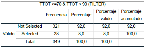 A continuación, se mostrarán a los docentes que cuentan con una calificación en el rango de 70 a menos de 90, se utilizó la fórmula 𝑇𝑇𝑂𝑇 >= 70 & 𝑇𝑇𝑂𝑇 < 90, de 349 registros se seleccionaron 28 docentes.