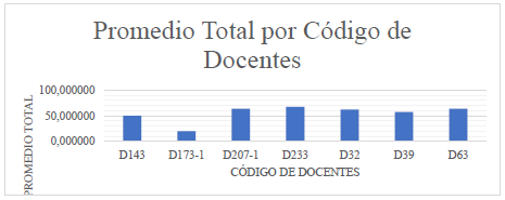 La siguiente gráfica muestra a los docentes que cuentan con un promedio menor a 70, la fórmula que se necesitó fue 𝑇𝑇𝑂𝑇 < 70; de los 349 registros se encuentran 7 docentes dentro de este rango.
