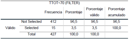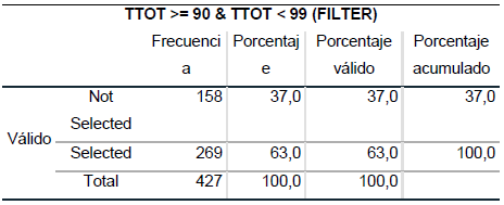 Se muestran a los docentes que cuentan con un promedio mayor de 99 en la calificación que obtuvieron en la evaluación realizada por los estudiantes de la Facultad de Ciencias Matemáticas y Físicas de la Universidad de Guayaquil, la fórmula matemática que se utilizó es 𝑇𝑇𝑂𝑇 >= 99, la tabla muestra que de 427 registros 88 son seleccionados en este rango.