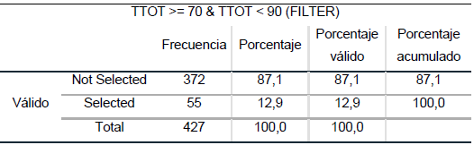 A continuación, se mostrarán a los docentes que cuentan con una calificación en el rango de 70 a menos de 90, se utilizó la fórmula 𝑇𝑇𝑂𝑇 >= 70 & 𝑇𝑇𝑂𝑇 < 90, de 427 registros se seleccionaron 55 docentes.