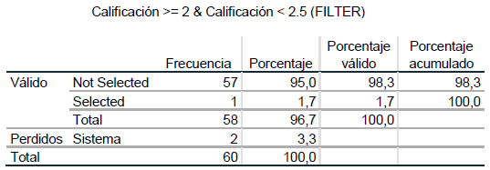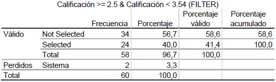 𝐶𝑎𝑙ifi𝑐𝑎𝑐ió𝑛 >= 2.5 & 𝐶𝑎𝑙ifi𝑐𝑎𝑐ió𝑛 < 3.54; de 60 docentes, 24 fueron seleccionados en este rango.