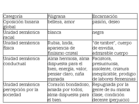 Deteniéndonos, entonces, en este apartado relativo a las características de estas dos mujeres y tomando en cuenta la redundancia o repetición, en tanto uno de los rasgos naturales del mensaje estético, se aprecia una constante referida al color de la piel de los personajes. Esta noción direcciona la invariable racial al espacio de los acontecimientos narrados y, en principio, a las cualidades de estas dos mujeres. Existen otros espacios como el económico, el social y el político.