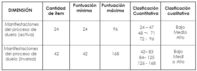 Tal como se mencionó en el apartado anterior, el instrumento es una escala tipo Likert, constituida por 66 ítems de afirmaciones que buscan describir las movilizaciones que tienen lugar en el sujeto al entrar en un proceso de duelo. Las puntuaciones de la escala varían según la dimensión que se esté analizando, tal como se muestra en la Tabla que se presenta a continuación. Para la dimensión Manifestaciones del proceso de duelo (activa), la puntuación mínima es de 24 y la puntación máxima que puede alcanzar es de 96; entendiéndose estos extremos como manifestación baja y/o alta de la dimensión activa en el sujeto estudiado. Asimismo, en la dimensión Manifestaciones del proceso de duelo