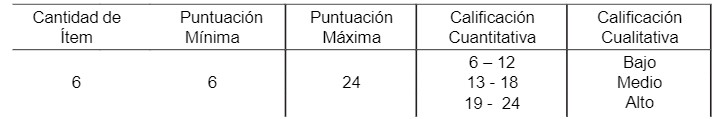 Los sujetos responden a las afirmaciones presentadas en el instrumento, ubicándose en una escala de valoración que va de 1 (totalmente en desacuerdo), a 4 (totalmente de acuerdo). Los criterios de clasificación SEGÚN los puntajes obtenidos en la escala son tres para cada dimensión, a saber: