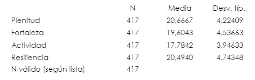Al contrastar estos resultados con el Baremo correspondiente (Ver Tabla No. 3) puede observarse que los sujetos tienen una puntuación alta en los indicadores plenitud, fortaleza y resiliencia, mientras que en actividad tienen una puntuación media, esto permite el análisis por parte del terapeuta para la interpretación de este tipo de resultados y adecuar la dirección de la intervención.