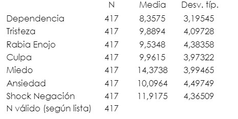 Como se observa en esta tabla, los indicadores dependencia, tristeza, rabia- enojo, culpa, ansiedad y shock-negación, están ubicados en la categoría Baja; mientras que el indicador Miedo tiene una puntuación alta. La lectura de estos resultados no se puede hacer independiente de los anteriores, reafirmando que el instrumento permite al terapeuta revisar el estado del proceso de duelo, desde las diferentes emociones y estados cognitivos que el individuo está movilizando en cada una de las etapas y cuales están presentes en mayor intensidad.