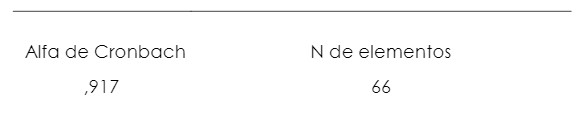 En ese sentido, la confiabilidad una vez se aplicó la prueba piloto fue de 0,917, durante el proceso se revisó cada uno de los ítems para determinar si alguno de los sesenta y seis (66) requerían ser eliminados porque tal vez no midieran lo que se deseaba medir, sin embargo, los resultados estadísticos