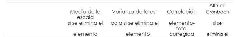Dentro de los estadísticos empleados para el análisis de la información tradu- cida en datos, se tienen: las medidas de tendencia central (media aritmética y las medidas de dispersión como la desviación estándar). De igual forma se calculó el coeficiente alfa de Cronbach, acompañado de los coeficientesde correlación correspondiente que permiten manejar la información básica para decidir sobre la permanencia de un ítem en el instrumento.