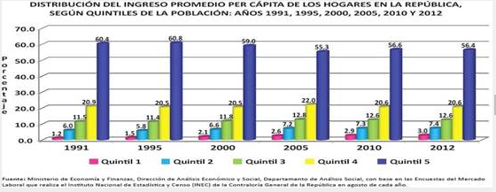 La distribución de los ingresos continúa siendo sumamente inequitativa en Panamá. En la gráfica N°1 se puede observar como hay una concentración de la riqueza en el 20% más rico de la población (quintil 5), que acapara más del 56% de los ingresos, en detrimento del restante 80% de la población, de manera sostenida en el tiempo.