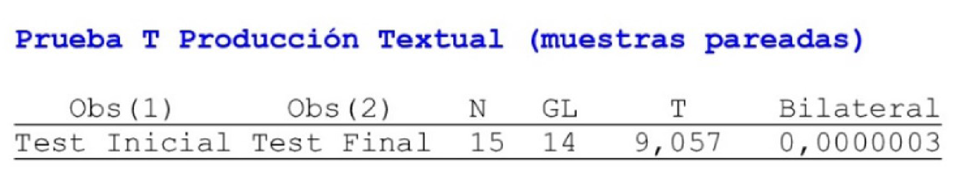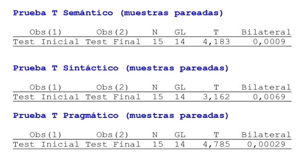 Gracias al refuerzo de estos temas, fue posible desarrollar en los estudiantes, diferentes habilidades relacionadas con la CPT, como la creación de textos orales y escritos con buena coherencia y cohesión, la argumentación y el debate de ideas, la expresión de ideas de manera clara y con una secuencia lógica, la organización y planeación textual, lo cual ayudó a superar gran parte de las falencias que ellos presentaron en el test inicial diagnóstico.