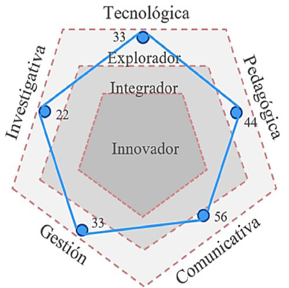 Diagnóstico de conocimiento y uso de las TIC en docentes. Teniendo en cuenta que, según Hernández et al., (2016), si el porcentaje es menor a 59 % se considera que los docentes están en un nivel explorador, entre un 59 % y 85 % están en un nivel integrador y mayor a 85 % en un nivel innovador, es claro que los docentes de la IENF -sede El Morrito- se ubican dentro del nivel explorador en cada una de las competencias TIC, ya que en cada una no lograron superar el 59 % (Figura 1). La competencia comunicativa es la que presenta una mayor puntuación, con un 56 %, seguida de la pedagógica con un 44 %, por lo que se considera que los docentes poseen algunos conocimientos básicos en cuanto al desarrollo de estas competencias. Por otra parte, en la competencia de tecnología alcanzaron solo un 33 %; en la de gestión un 33 % y en la investigativa un 22 %, lo cual evidenció su bajo conocimiento sobre los alcances y limitaciones que puede tener la incorporación de estas tecnologías en la formación integral de los estudiantes y en su propio desarrollo profesional.