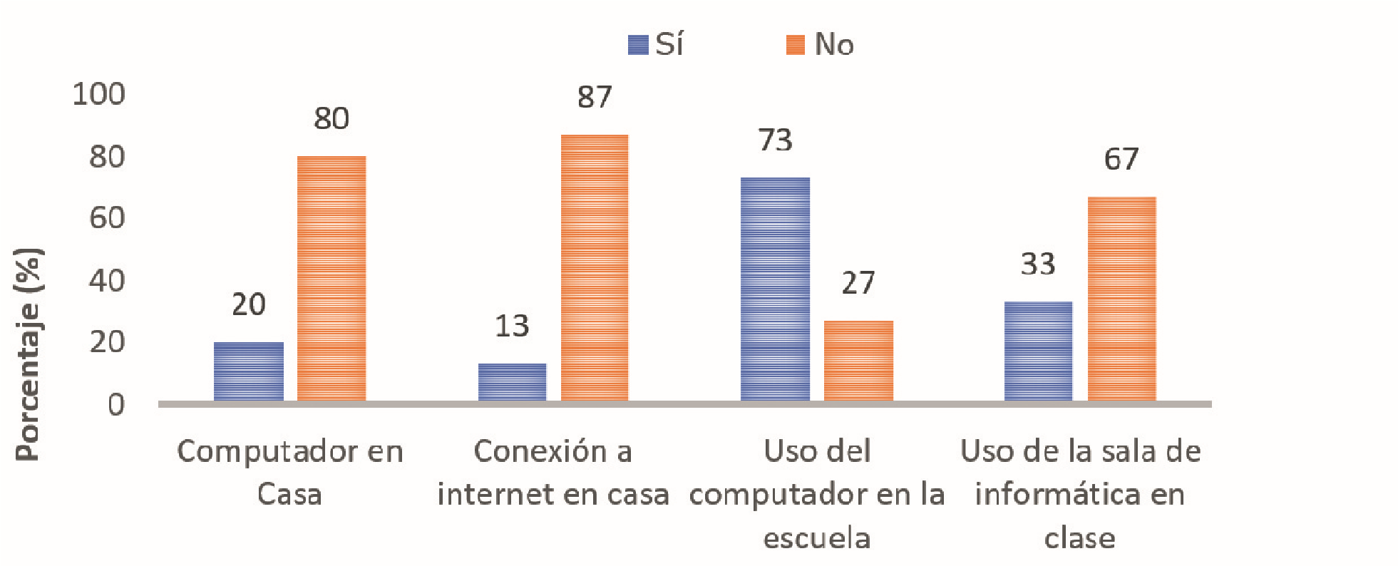 Diagnóstico de conocimiento y uso de las TIC en estudiantes. A la pregunta ¿Tienes computador en tu casa?, solo el 20 % de los estudiantes respondió afirmativamente, siendo este un recurso esencial que favorece el proceso de aprendizaje de las TIC. A la pregunta ¿Tienes conexión a internet en tu casa?, únicamente el 13 % de ellos respondió que sí. Estos resultados reflejan que la única oportunidad que tienen de aprender sobre el adecuado manejo del computador e internet, son los espacios académicos que se presentan dentro de la IENF (Figura 2). En cuanto a emplear el computador en la IENF, el 73 % de los estudiantes lo ha utilizado, por lo que es necesario promover su uso, si lo que se busca es mejorar las competencias TIC, teniendo en cuenta que la mayoría no cuenta con este recurso en casa. En cuanto al uso de la sala de informática por parte de los docentes para el desarrollo de las clases, el 67 % de los estudiantes refirió que el docente casi nunca la utiliza, mientras que el 33 % afirmó que, algunas veces (Figura 2). De acuerdo con esto, se observó que los docentes emplean una metodología de enseñanza tradicional, con una baja inclusión de herramientas tecnológicas como estrategias de pedagogía.