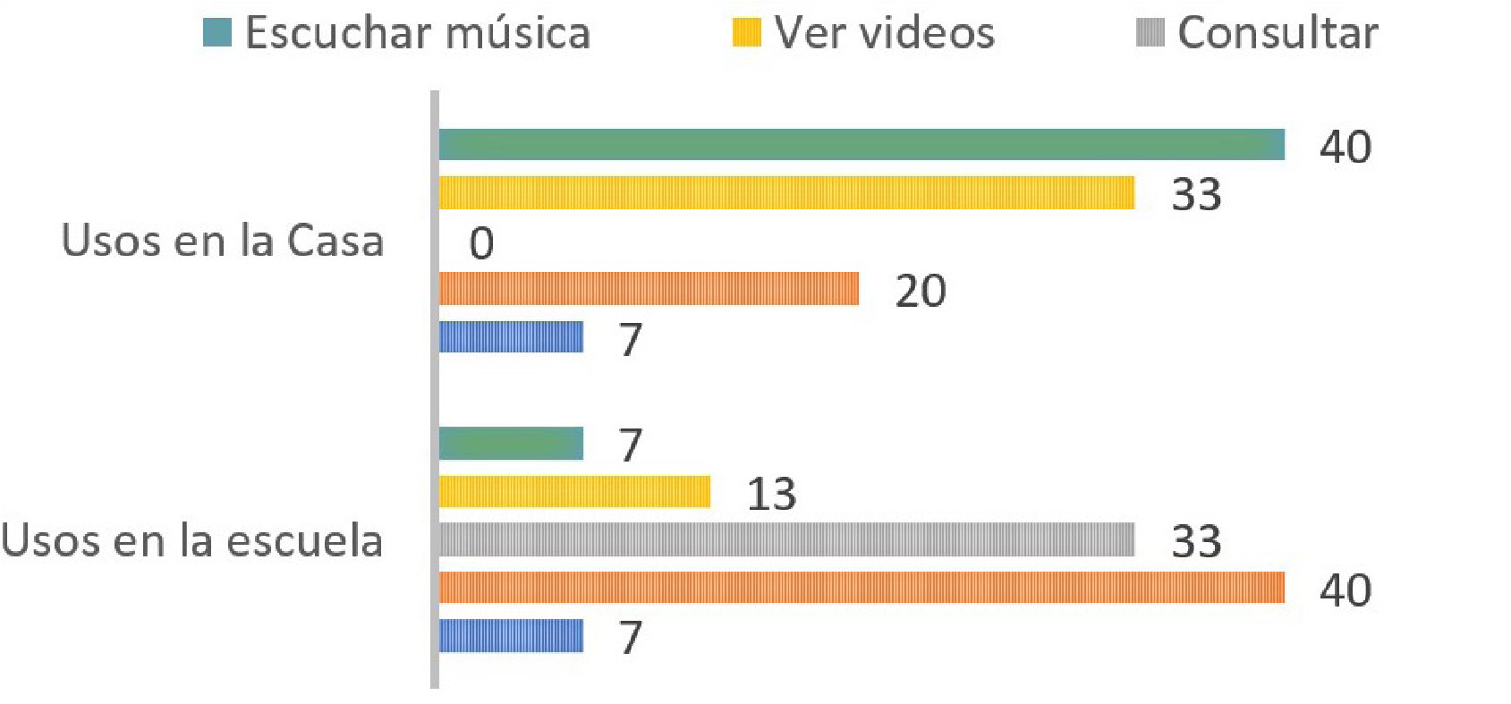 Respecto al uso del computador en casa, el 40 % de los estudiantes lo usa para escuchar música y, el 33 % para ver videos o películas (Figura 3). Esto reflejó que la mayoría de ellos lo ha utilizado para realizar actividades de ocio y recreación. Los resultados de la encuesta reflejaron el desconocimiento que tienen acerca del uso apropiado del computador, como herramienta para fortalecer su proceso de aprendizaje, adquirir conocimiento y fortalecer sus competencias en cuanto a las TIC. Referente al uso del mismo en la IENF, se ha utilizado para realizar tareas o trabajos, en un 40 % y, para buscar información en internet, en un 33 %, lo cual evidenció que, la finalidad de los estudiantes en el uso del computador es de carácter académico (Figura 3). Considerando esto, es importante llevar a cabo un proceso de formación y acompañamiento para fortalecer en ellos las competencias TIC.