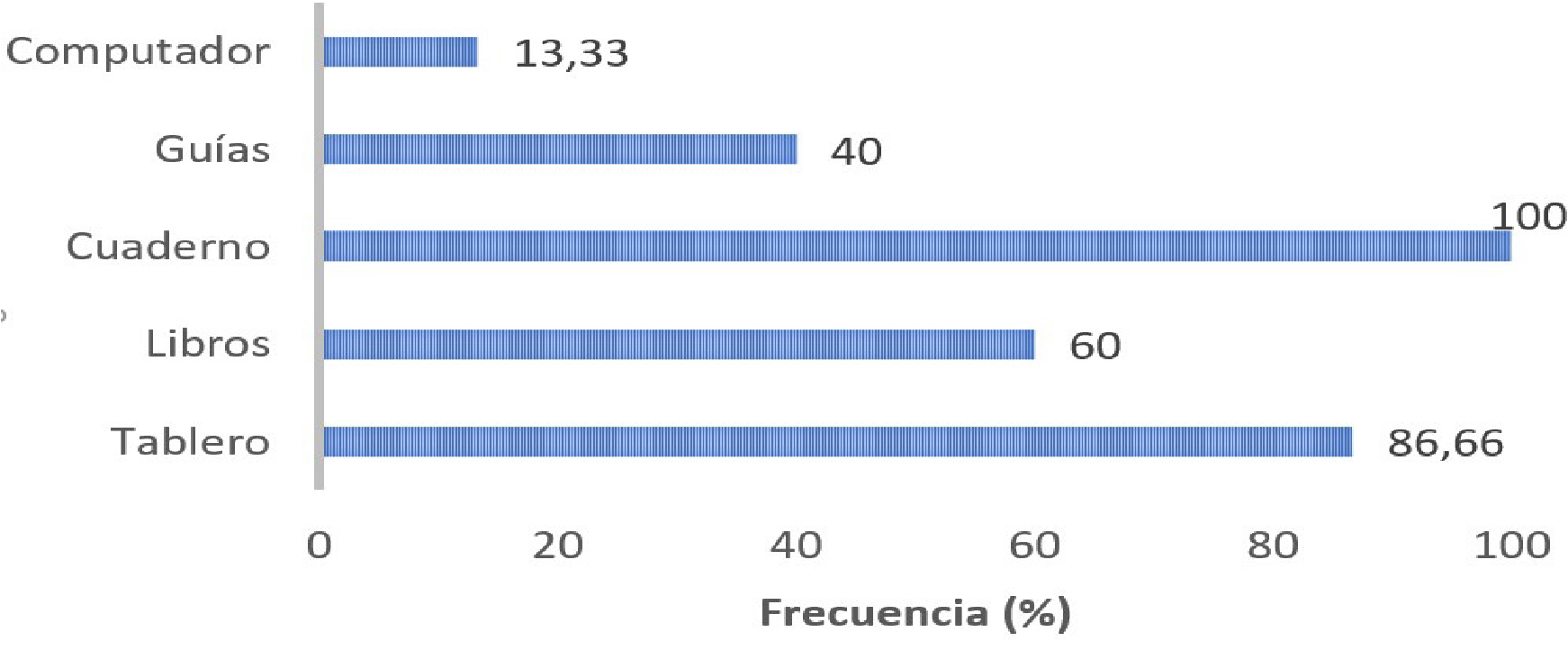 De acuerdo con lo reportado por los estudiantes, para el desarrollo de sus clases los docentes han utilizado recursos educativos como el cuaderno, 100 %, el tablero 86 %, libros 60 %, guías 40 % y, en menor medida, el computador 13 % (Figura 4), lo cual refleja el empleo de recursos y metodologías pedagógicas tradicionales, dejando relegadas las herramientas que brindan las TIC; es claro que, los docentes transmiten su saber de una forma muy conceptual, limitando la posibilidad que los estudiantes tienen de fortalecer las competencias TIC.