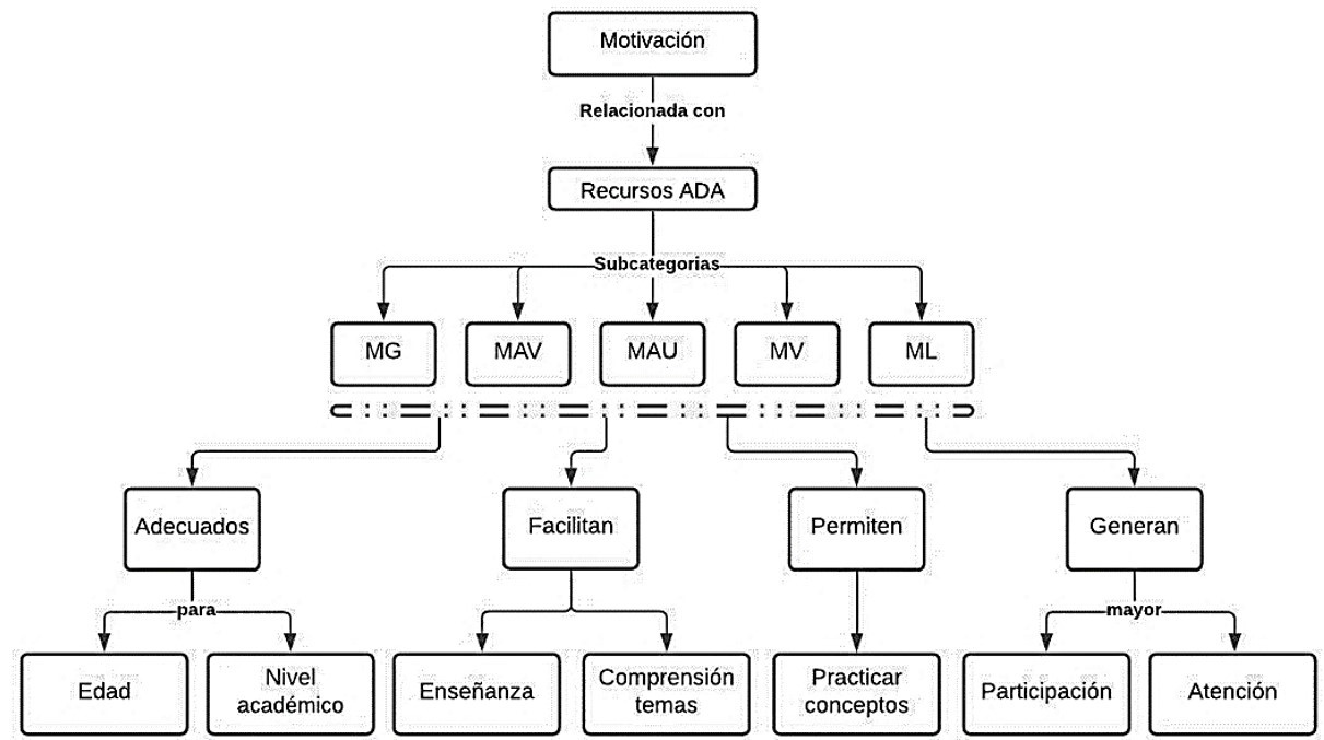 De manera general, se observó que la motivación está directamente relacionada con los recursos que hacen parte del ADA, a partir de los cuales fueron creadas las subcategorías. En la Figura 8 se presenta una síntesis de los principales hallazgos encontrados en la categorización, donde se observó que los recursos utilizados en el ADA son adecuados para la edad y nivel de conocimiento de los estudiantes, instituidos en elementos fundamentales en el proceso de enseñanza de la CPT, ya que facilitaron al docente el proceso de enseñanza y, al estudiante, la comprensión de los diferentes contenidos temáticos vistos en clase, al aportar elementos que permitieron reforzar y practicar los conceptos adquiridos. Además, los recursos contribuyeron a generar una mayor participación de los estudiantes dentro del proceso de implementación del ADA y una mayor atención por las temáticas tratadas y las actividades desarrolladas.