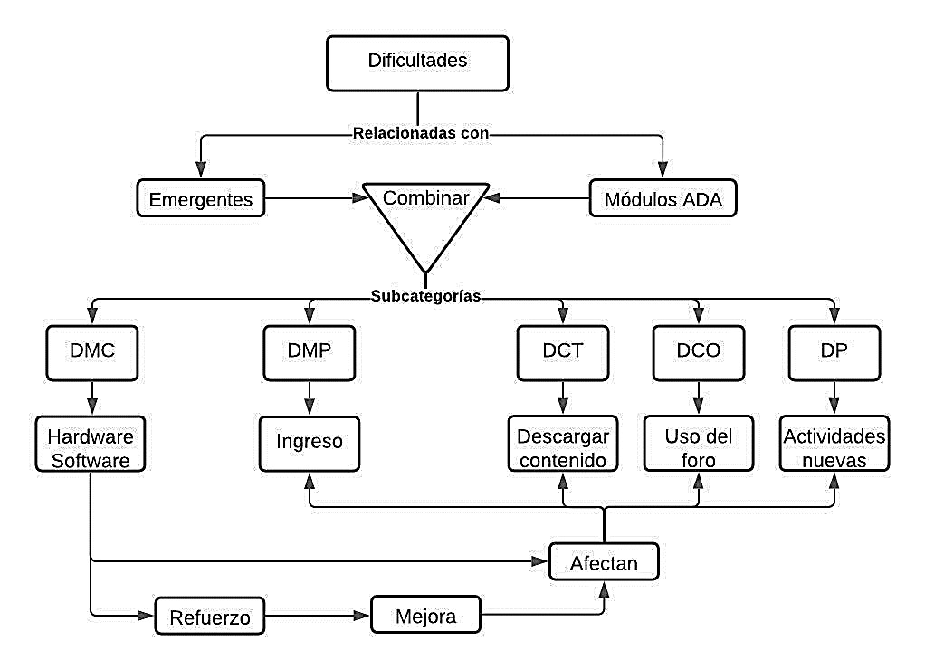 En la Figura 9 se aprecia una síntesis de los principales hallazgos encontrados en la categorización, donde se observó que las dificultades en la subcategoría DMC están relacionadas con el manejo del hardware, software e internet. Las dificultades de la subcategoría DMP estuvieron enfocadas en la dificultad de los estudiantes para ingresar a la plataforma. En la subcategoría DCT, la mayor dificultad fueron los pasos a seguir para visualizar y descargar el contenido temático. Para la subcategoría DCO, las dificultades estuvieron en el uso de los foros de comunicación con el docente y estudiantes, al realizar aportes grupales. Finalmente, en la subcategoría DP, las dificultades se dieron en el desarrollo de prácticas en los talleres, en especial al utilizar programas que no habían sido utilizados con anterioridad por los estudiantes.