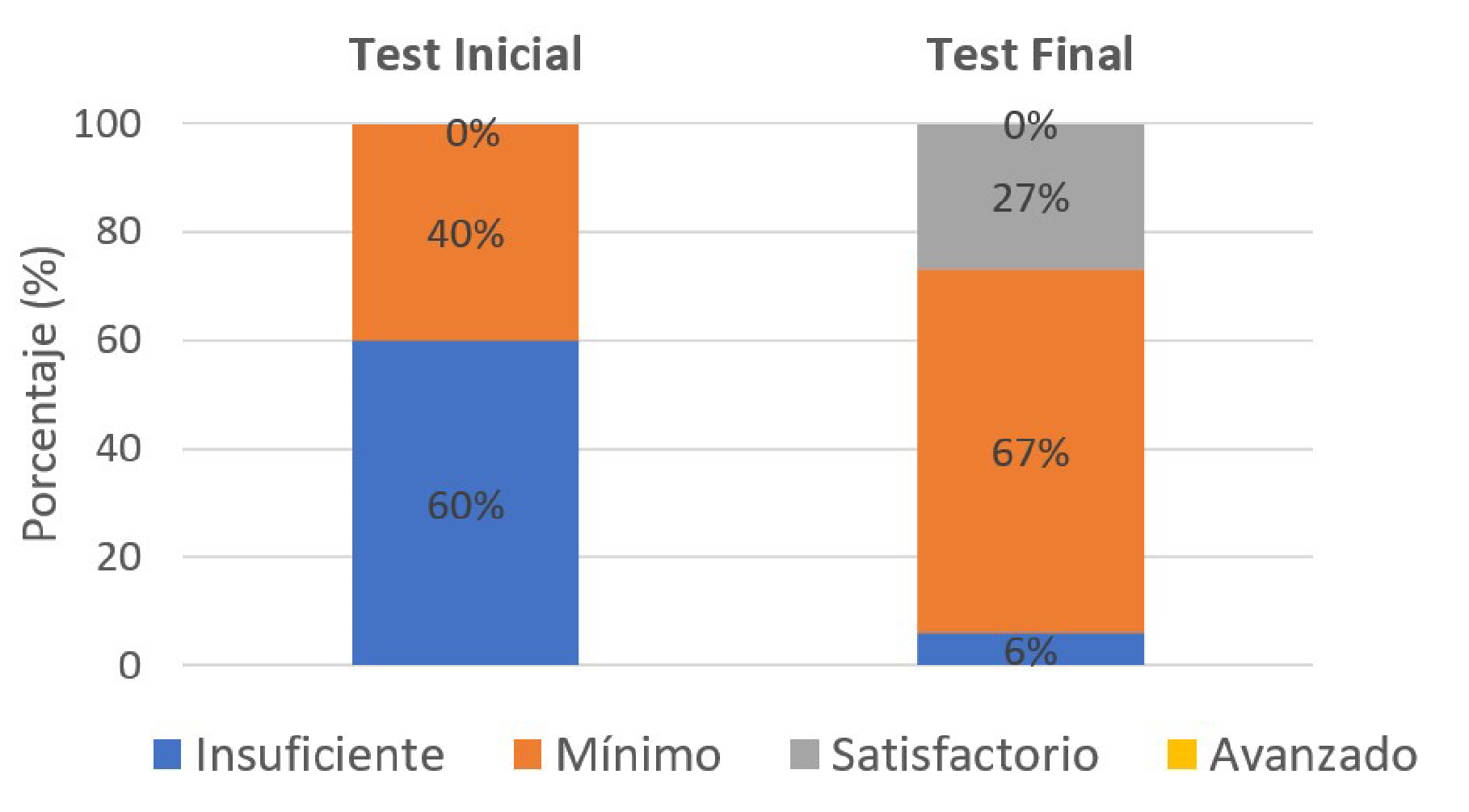 Una vez realizada la prueba t Student, de comparación entre el test inicial y final de CPT, se observó diferencias estadísticamente significativas, con un incremento positivo en la evaluación de esta competencia (Figura 10). Por consiguiente, los resultados reflejaron que el ADA fortaleció la CPT y mejoró estadísticamente el nivel académico de los estudiantes. Adicionalmente, en este test se puede observar que el 27 % de ellos alcanzó el nivel satisfactorio, el 67 % el nivel mínimo y, tan solo el 6 % restante, el nivel insuficiente. Se dio una mejora en la CPT por efecto del ADA, ya que disminuyó el porcentaje de estudiantes con nivel insuficiente, pasando de un 60 % en el test inicial, a un 6 % en el test final. Además, se incrementó el porcentaje de estudiantes que alcanzaron el nivel satisfactorio, pasando de un 0 % en el test inicial a un 27 % en el test final (Figura 11). En el test final se notó que los estudiantes crearon textos con mayor coherencia y cohesión, perfeccionaron su argumentación textual y mejoraron sus técnicas de organización y progresión de ideas, logrando una adecuada planeación textual.