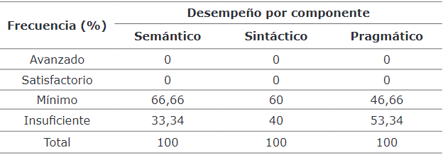 Componente Semántico. El 66,66 % de los estudiantes alcanzó un desempeño mínimo y, el 33,34 %, un nivel de desempeño insuficiente. Los estudiantes presentaron marcadas falencias a la hora de crear textos que respondan a las diversas necesidades de comunicación en la selección de líneas de consulta atendiendo a las características del tema y el propósito del escrito; y, en la comprensión de los mecanismos de uso y control que permiten regular el desarrollo de un tema en un texto, dada la situación de comunicación particular.