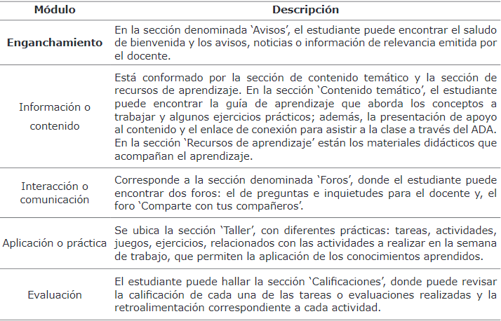 Estructura del ADA. Para el diseño de la estructura del ADA se incluyó los cinco módulos principales que deben conformarlo (Tabla 2): enganchamiento, información/contenido, interacción/ comunicación, aplicación/práctica y evaluación, en consonancia con lo establecido por Villarreal (2018).