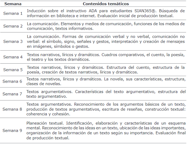 Contenidos temáticos. Los contenidos temáticos dentro del diseño del ADA fueron distribuidos en nueve semanas de trabajo (Tabla 3), que buscaban reforzar el desarrollo de la competencia de CPT en los estudiantes.