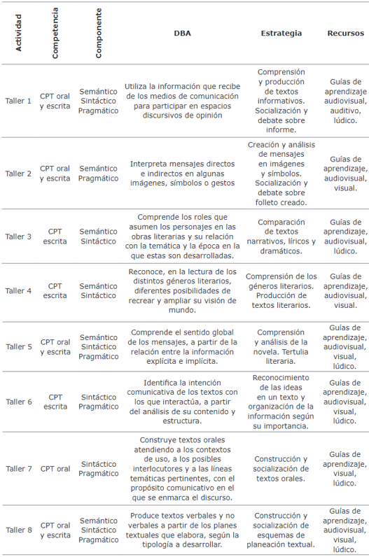 Diseño de actividades pedagógicas. Se fundamentó principalmente en cada uno de los Derechos Básicos de Aprendizaje (DBA) establecidos por el MEN (2013), para estudiantes de quinto grado de primaria en el área de lenguaje. De igual manera, se contempló los resultados del diagnóstico de CPT, que evidenciaron falencias en los tres componentes semántico, sintáctico y pragmático, donde el nivel de desempeño más alto alcanzado por los estudiantes es el nivel mínimo. Se diseñó ocho actividades pedagógicas que incluyeron dentro de su estructuración, el uso de diferentes recursos TIC, que ya fueron descritos. En la Tabla 4 se observa la descripción detallada de las actividades pedagógicas diseñadas.