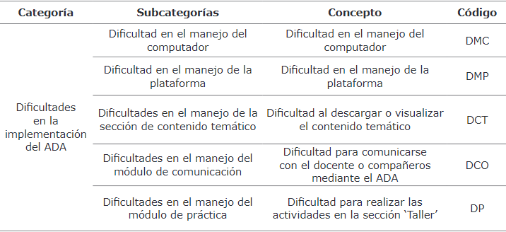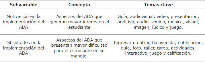 Subvariable: ‘Dificultades en la implementación del ADA en el aula de clase’. En el proceso de categorización abierto y axial fueron afianzados segmentos de texto que hacían referencia a los aspectos del ADA que presentan mayor dificultad en el manejo para los estudiantes. Al finalizar la consolidación de los segmentos de texto se dio inicio a la categorización selectiva para la creación de categorías y subcategorías, para lo cual se analizó los temas clave establecidos y su relación con los módulos que conformaron el ADA. Considerando que los módulos de enganchamiento y evaluación no presentaron segmentos de texto, no fueron tenidos en cuenta. Además, hubo temas clave emergentes como el manejo del computador y el de la plataforma, que fue necesario incluir. A continuación, se creó cinco subcategorías que enmarcan los diez temas clave y se realizó la codificación para cada subcategoría (Tabla 7).