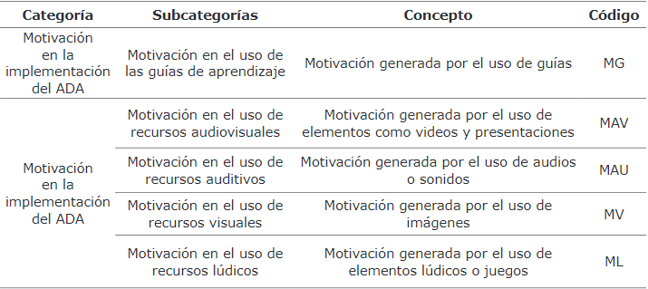 Subvariable: Motivación en la implementación del ADA. En el proceso de categorización abierta y axial fueron consolidados los segmentos de texto identificados dentro del diario de campo, que hacen referencia a los aspectos del ADA que generaron mayor interés en los estudiantes y, eliminados los temas clave en los cuales no se evidenció segmentos de texto. Una vez consolidados estos últimos, se procedió a realizar la categorización selectiva, para obtener las categorías y subcategorías que expresasen el fenómeno de investigación e integrasen los temas clave de la codificación abierta y axial. Para la creación de las subcategorías se analizó la relación entre los temas clave establecidos y los recursos que hacían parte del ADA; se creó cinco subcategorías que enmarcaban los nueve temas clave y se realizó la codificación para cada subcategoría (Tabla 6).