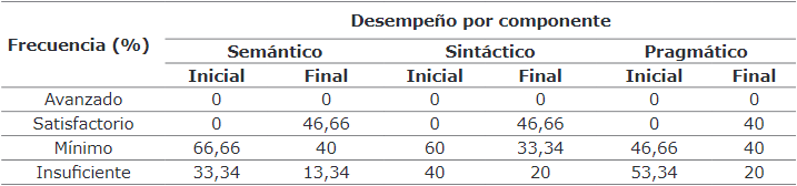 Diagnóstico de la competencia básica de producción textual. En el test inicial aplicado se observó que el 60 % de los estudiantes presentó un desempeño insuficiente en CPT, mientras que el 40 % restante presentó un desempeño mínimo dentro de esta competencia. Ninguno de ellos logró alcanzar el nivel satisfactorio o avanzado; esto refleja la necesidad que tienen de profundizar en el aprendizaje de la CPT. Los estudiantes presentaron dificultad en la producción de textos escritos que responden a diversas necesidades comunicativas, teniendo en cuenta las exigencias del contexto. Además, tuvieron problemas en algunos aspectos gramaticales importantes en la CPT, como: la concordancia del texto, el manejo de los tiempos verbales, el manejo de los nombres y pronombres y la ortografía. La Tabla 1 muestra los resultados obtenidos en el test diagnóstico de CPT y detalla el desempeño que presentaron los estudiantes en cada uno de los componentes: semántico, sintáctico y pragmático, teniendo en cuenta los niveles: avanzado, satisfactorio, medio y bajo.