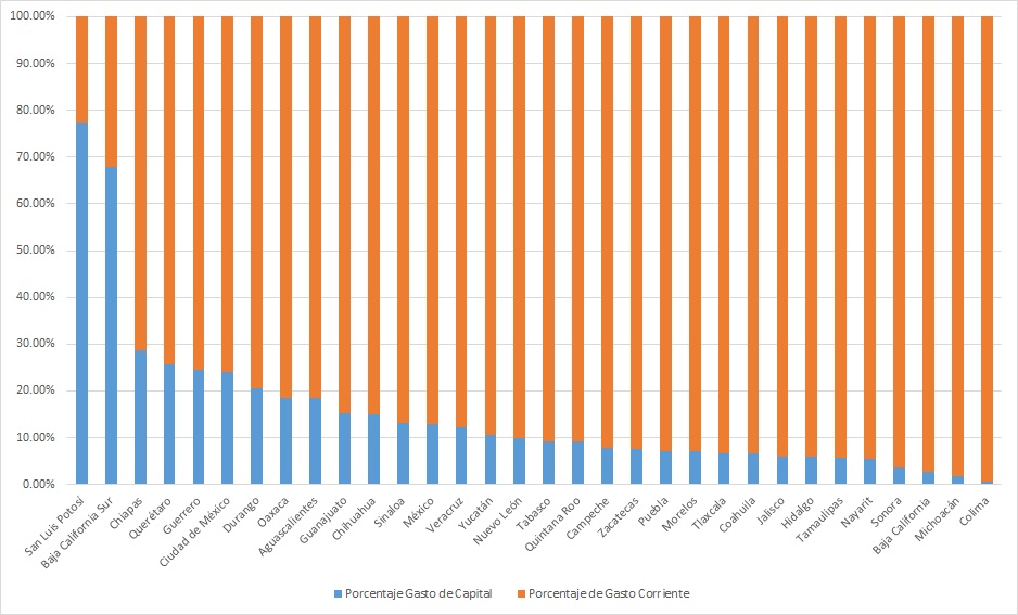 Sin embargo, cuando revisamos los montos reportados en el “Estado Analítico del Ejercicio del Presupuesto de Egresos, Clasificación Económica por Tipo De Gasto” de las Cuentas Públicas de cada entidad federativa en 2019, observamos que el porcentaje destinado al gasto de capital es proporcionalmente muy pequeño en la mayor parte de los estados. Hay 17 entidades federativas que destinan menos del 10% de sus recursos totales a gasto de capital y así lo reportan en sus cuentas públicas. Adicionalmente, hay 8 entidades federativas que reportan entre el 10 y el 20% de gasto de capital. El Estado de San Luis Potosí reporta más del 75% de gasto de capital y el Estado de Baja California Sur reporta menos del 70% del gasto público a gasto de capital, por lo que requerirían un análisis más profundo.