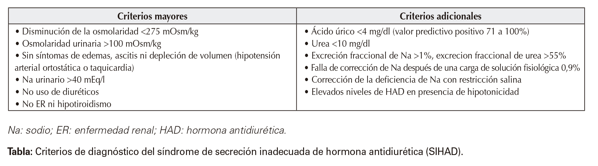 La mayor dificultad diagnóstica se presenta en la hiponatremia asociada a hipoosmolaridad o síndrome de secreción inadecuada de hormona antidiurética (SIHAD) (siempre conviene descartar hipotiroidismo severo o insuficiencia adrenal primaria o secundaria). Existen criterios mayores y adicionales para su diagnóstico (Tabla)12.