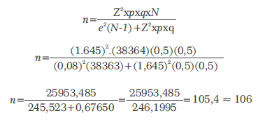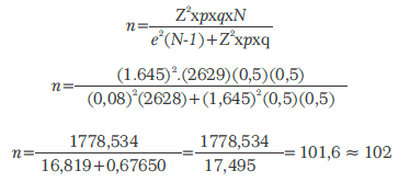 Por su parte, se calcula una muestra nita, ya que se conoce el número de población definida para el estudio, para la cual se generaliza del total de docentes y estudiantes. Para la definición de las submuestras se utiliza un nivel de confianza del 90%, con un margen de error del 8%. Para los estudiantes, la submuestra se calcula sobre un total de 38.364 personas, lo que da como resultado 106. Para docentes, la submuestra equivale a 102 personas, de un total poblacional de 2.628.Los anteriores cálculos se realizaron con la ecuación para población finita respectivamente, como se muestra a continuación: