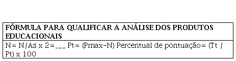Para a atribuição da pontuação de cada questão, recomenda-se adotar: 2 para ótimo; 1 para adequado; 0 para inadequado, e N/A se a questão não se aplica ao produto educacional. A pontuação máxima que pode ser alcançada é de 44 pontos (100%), isto é, ótimo para todas as questões. Para realizar o cálculo adequado, deve-se seguir esta fórmula (Quadro 2). A fórmula é baseada na pesquisa de Souza, Turrini e Poveda (2015) do SAM: