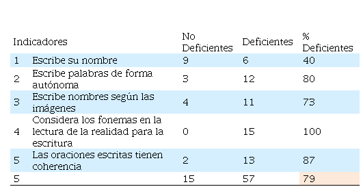 En la tabla se expresa el comportamiento de los indicadores, según el producto de la escritura de los estudiantes en el desarrollo de la prueba pedagógica, analizada el grado de incidencia en el problema de estudio, se constata el bajo rendimiento de la escritura de los estudiantes en el primer año de escolaridad de primaria.