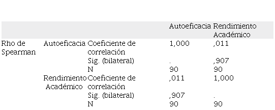 No existe relación significativa entre rendimiento académico y la autoeficiencia en estudiantes en una institución educativa de Lima, ya que, según los resultados obtenidos por el coeficiente de correlación entre las variables es de 0,011, revelando que la correlación entre estas variables es baja. Además, la significancia de p valor es igual a 0.907 (p>0.05).