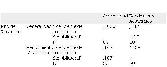 Según los resultados de la Tabla 2, se tiene que el coeficiente de correlación, Rho de Spearman entre la dimensión generalidad y la variable rendimiento académico es de 0,142 revelando una correlación baja. Además, la significancia de p valor es igual a 0.107 (p>0.05), aceptando la hipótesis nula por lo que se afirma que Ho: No hay una relación significativa entre el rendimiento académico y la dimensión generalidad de la autoeficiencia en estudiantes en una institución educativa de Lima.